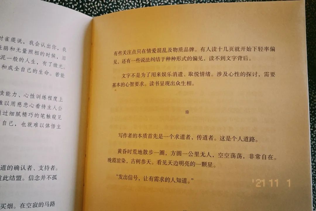 书中大量篇幅与阅读相关,朋友说她一年估计能看一千本书,她说一千本并没有,但感兴趣的几个门类和作者会反复读。她认为输出需要先输入,用自己的生命经验与认知与输入内容互相验证,然后输出感受。