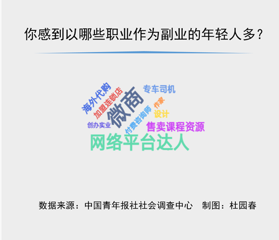 日前,中国青年报社社会调查中心联合问卷网(wenjuan.com),对2454名18-35周岁青年进行的一项调查显示,81.7%的受访青年感到身边做副业的年轻人多了。微商、网络平台达人、售卖课程资源这三种副业最受欢迎。开展副业,72.0%的受访青年认为能有机会尝试更多可能性,63.5%的受访青年表示能丰富精神生活和业余生活。