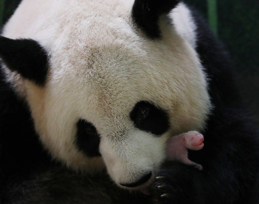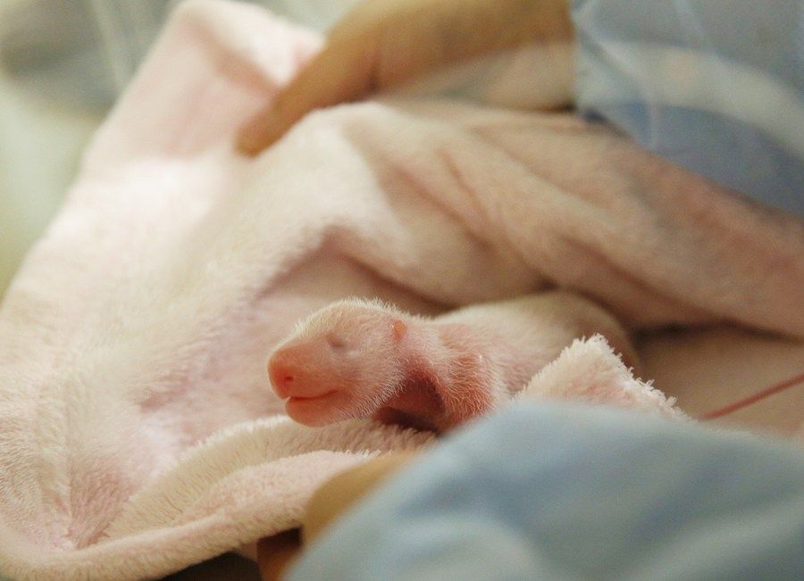 这是2021年8月2日在法国博瓦勒动物园拍摄的大熊猫“欢欢”的双胞胎幼崽之一。(新华社记者高静摄)