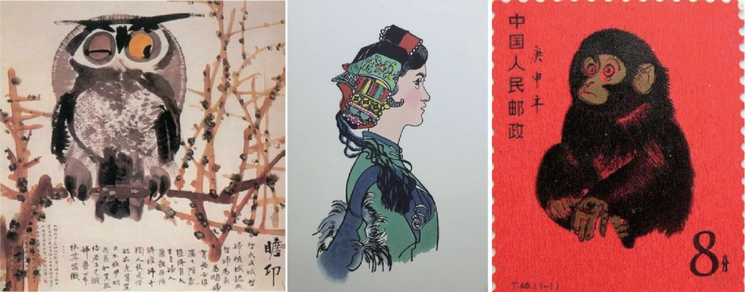 图1 左图:黄永玉画的猫头鹰,有多少人知道背后的荒唐历史闹剧;黄永玉创作的套色木刻《阿诗玛像》(中),设计的猴票(右),都成为中国当代美术史上的经典作品