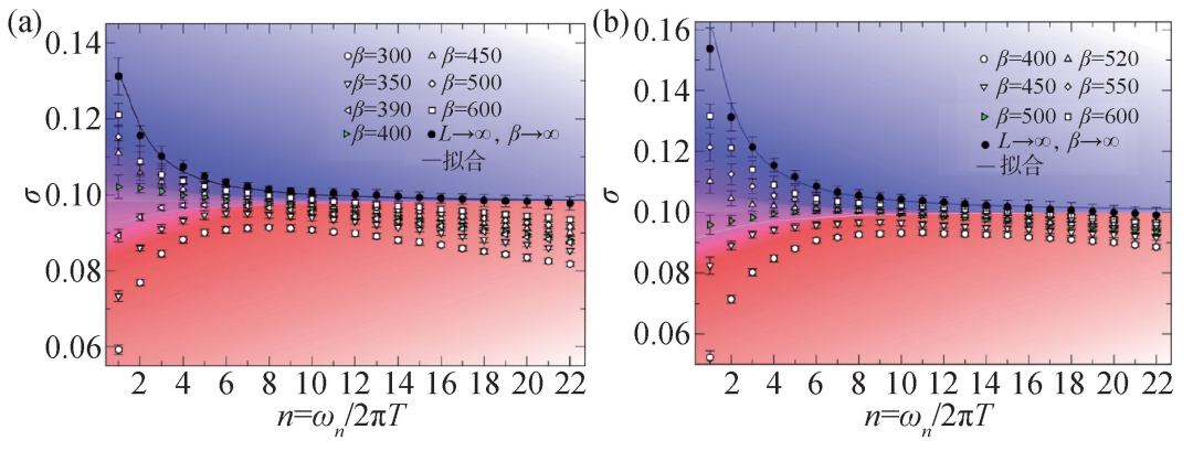 图3 (a)不同温度(β=1/T )下,蒙特卡洛计算所得的玻色子电导关于松原频率的变化σ (ωn)。在热力学极限下,温度趋于零温时,从奇Z2 QSL到超流相的(2+1)d XY*量子相变点上,电导的平台值σXY*=0.098(9)。该值在统计误差范围内恰好是传统(2+1)d XY相变点电导σXY =0.3554的1/4。此处的自对偶温度β *~ 400(T*~1/400);(b)类似的蒙特卡洛计算结果,对于从偶Z2 QSL到超流相的(2+1)d XY*量子相变点,1/4的分数化电导和自对偶温度也稳定存在