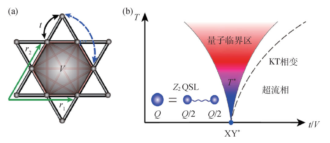 在诸多阻挫磁体模型中,二维笼目 (kagome) 晶格的Balents—Fisher—Girvin模型 (简称BFG模型) 很受数值计算和解析理论同行们青睐。如图2(a)所示,BFG模型每个kagome格点上有一个量子的自旋1/2自由度,用硬壳玻色子的语言来讲,就是在每个格点上,S+、S-分别代表玻色子的产生、湮灭算符,Sz代表玻色子的占据数算符。这个模型只有短程的两体自旋 (或者玻色子) 相互作用,而不像有些拓扑序严格可解模型中复杂的多体和长程相互作用,即图2(a)中最近邻S+S- (玻色子的跃迁) 交换相互作用t和六边形之内的SzSz (玻色子的密度—密度排斥) 阻挫相互作用V。为了实现Z2为偶的拓扑序,我们又在模型中加入相邻六边形之间的玻色子密度—密度排斥V ′。如此的模型既有Z2拓扑序量子自旋液体的基态 (Z2 quantum spin liquid,Z2 QSL),也有铁磁XY长程序的基态(如果用玻色子的语言就是破缺玻色子U(1)对称性的超流态 (super fluid,SF))。两个基态之间的相变,不同于传统的玻色—哈伯德 (Bose—Hubbard) 模型中从玻色子莫特绝缘体到超流态的(2+1)d XY相变,而因为此处的莫特绝缘体具有了Z2拓扑序和涌现自旋子 (spinon) 和vison任意子,相变类型变成了(2+1)d XY*,具有了不同的量子临界描述。(见参考文献[1—4]中关于这个模型和相图的系列工作和系统描述。)