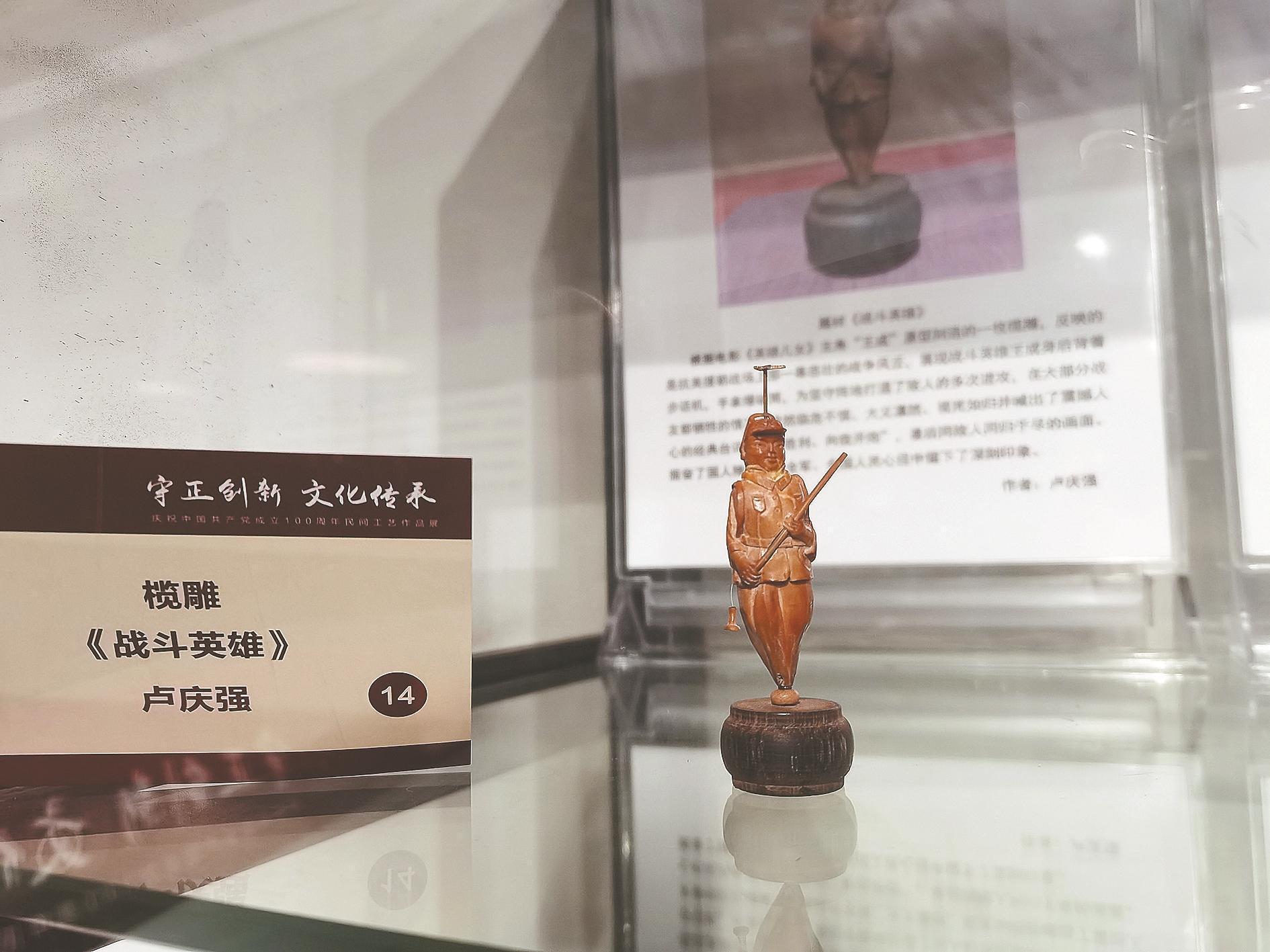 羊城晚报讯 记者黄宙辉、通讯员马少娴摄影报道:18日,“守正创新 文化传承——庆祝中国共产党成立100周年民间工艺作品展”在广州海珠区少年儿童图书馆开幕。本次展览由广州市文联、广州市民间文艺家协会、广州市海珠区文化广电旅游体育局主办,共展出97件民间工艺作品。