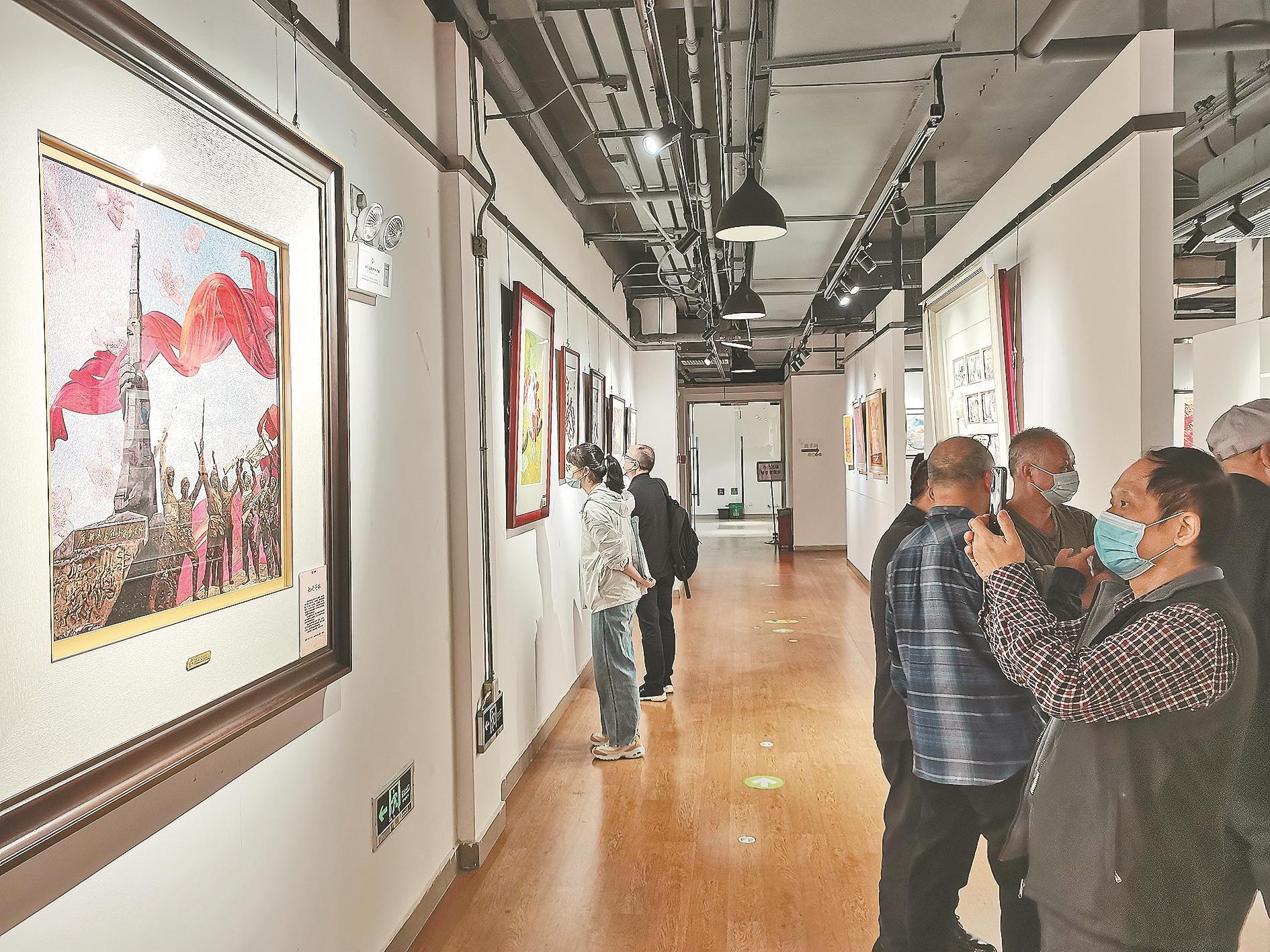 王新元广绣作品《红映英雄》吸引市民驻足观看