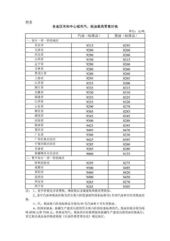 根据近期国际市场油价变化情况,按照现行成品油价格形成机制,自2021年11月19日24时起,国内汽、柴油价格(标准品,下同)每吨分别降低95元和90元。调整后,各省(区、市)和中心城市汽、柴油最高零售价格见附表。相关价格联动及补贴政策按现行规定执行。