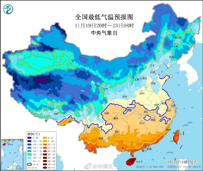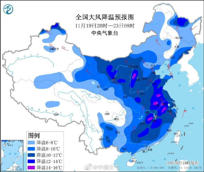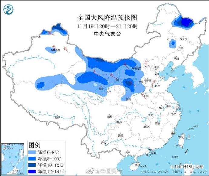 受较强冷空气影响,11月19日20时至23日08时,我国自西北向东南将有一次大风降温天气过程:大部地区气温将先后下降6~10℃,内蒙古西部、山西西部、黄淮东部、江淮中东部、江南北部和西南部等地的部分地区降温幅度可达12℃,局地14℃以上。中央气象台11月19日18时发布寒潮蓝色预警。