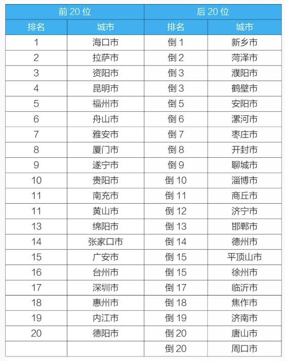10月168个重点城市空气质量排名前20位和后20位城市名单