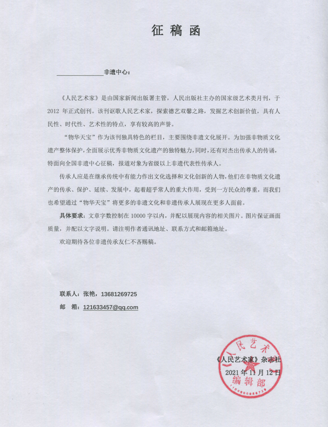 “物华天宝”作为《人民艺术家》杂志独具特色的栏目,主要围绕非遗文化展开。为加强非物质文化遗产整体保护,全面展示优秀非物质文化遗产的独特魅力,介绍杰出传承人,特面向全国非遗中心征稿,报道对象为省级以上非遗代表性传承人。