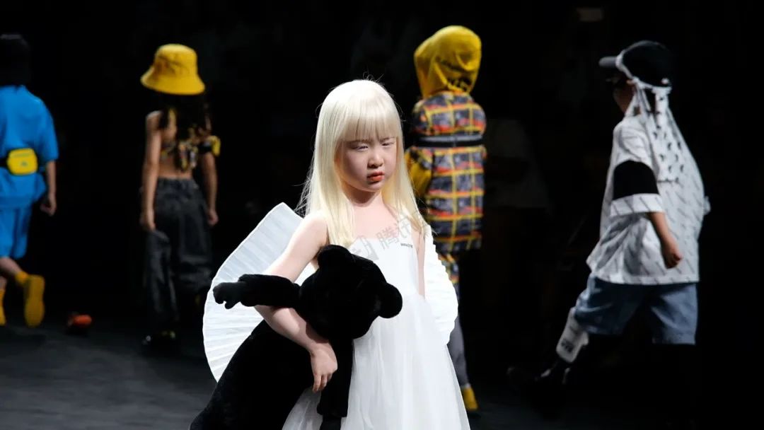 在服装秀场的后台,几个孩子围观着全身雪白的小模特奇迹,尽管早已无数次被各种目光和疑问包围,她还是低下了头。
