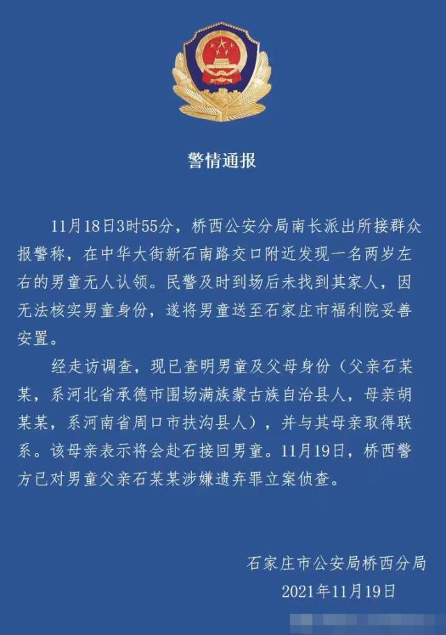 ·河北石家庄一2岁男童无人认领,警方:已对其父涉嫌遗弃罪立案侦查。