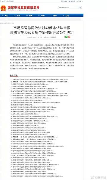 【市场监管总局依法#对43起未依法申报违法实施经营者集中案作出行政处罚#】市场监管总局20日公布对43起未依法申报违法实施经营者集中案作出的行政处罚决定,对涉案企业分别处以50万元罚款。依据反垄断法,市场监管总局对43起未依法申报违法实施经营者集中案件立案调查。本次公布的案件均为过去应当申报而未申报的交易,案件数量多、涉及企业广泛、交易时间跨度较长。依法处理未依法申报案件,既能保障各类市场主体公平参与竞争,维护反垄断法权威,不断优化公平、透明、可预期的竞争环境;又能有效督促企业提升合规意识和能力,推动企业和行业持续健康发展。(记者赵文君)