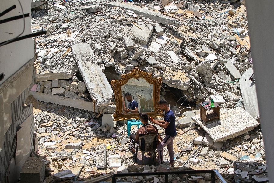 5月26日,在加沙地带北部的城镇贝特拉希亚,23岁的巴勒斯坦理发师阿卜杜拉·扎瓦拉在他被以色列炸毁的房屋前为顾客免费服务。(新华社发,里泽克·阿卜杜勒·贾瓦德摄)