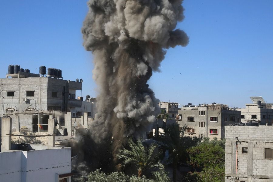 图为5月19日,在加沙地带的拉法,遭空袭的建筑升起浓烟。(新华社发,哈利德·奥马尔摄)