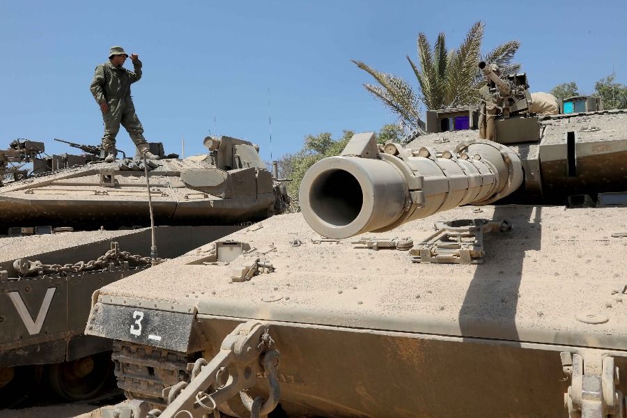 这是8月25日在靠近加沙地带北部边境的以色列斯代罗特拍摄的以色列士兵和坦克。(新华社发,吉尔·科恩·马根摄)