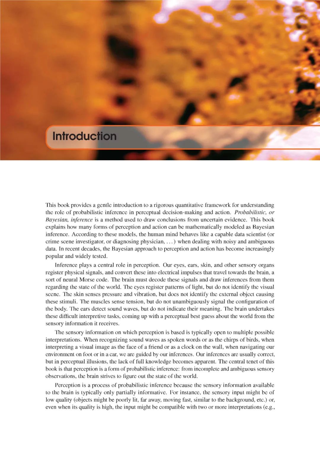 推理在感知中起着核心作用。我们的眼睛、耳朵、皮肤和其他感觉器官记录身体信号,并将这些信号转化为电脉冲,传输到大脑,类似神经的摩尔斯码。大脑必须解码这些信号,并从这些信号中推断出世界的状态。眼睛记录光的模式,但不能识别视觉场景。皮肤能感觉到压力和振动,但不能识别引起这些刺激的外部物体。肌肉能感觉到紧张,但不能明确地指示身体的结构。耳朵能探测到声波,但并不表明其含义。大脑承担着这些困难的解释任务,通过接收到的感官信息对世界做出感性的最佳猜测。