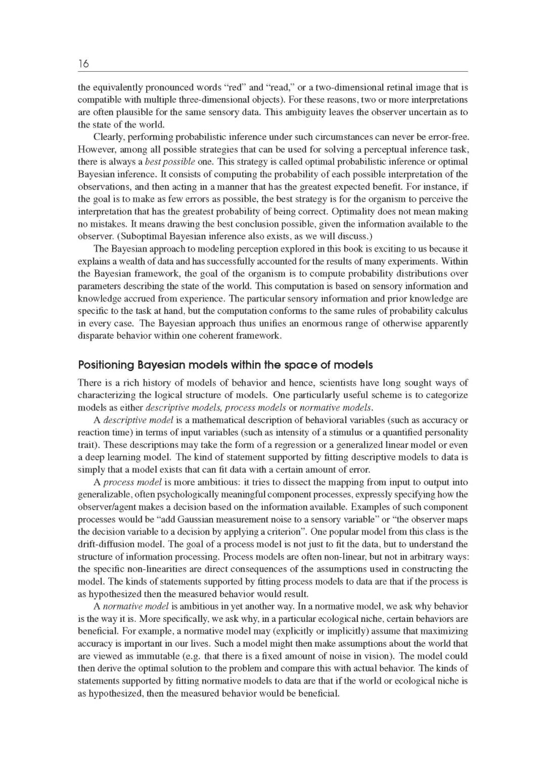虽然这本书的重点是感知和行动,贝叶斯模型在认知科学和心理学的其他领域是广泛有用的。特别是,贝叶斯模型在高级认知[2]中有着丰富的历史,至少可以追溯到乔纳森·埃文斯[43]和约翰·安德森[21]的工作,对认知发展的理解做出了巨大贡献[53,123]。本书中偶尔会出现更高层次的认知,特别是在第6章(学习)、第12章(变化世界中的推理)和第13章(推理与实用的结合)中。在第15章(背景中的贝叶斯模型)中,我们评论了感知和认知之间的差异。
