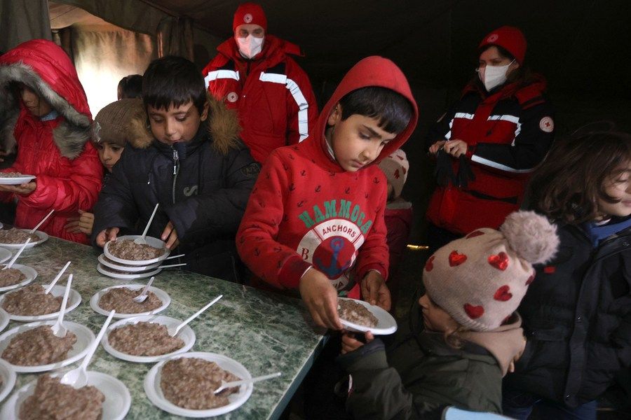 2021年11月19日,难民儿童在白俄罗斯与波兰边境白方一侧领取食物。(新华社/白通社)