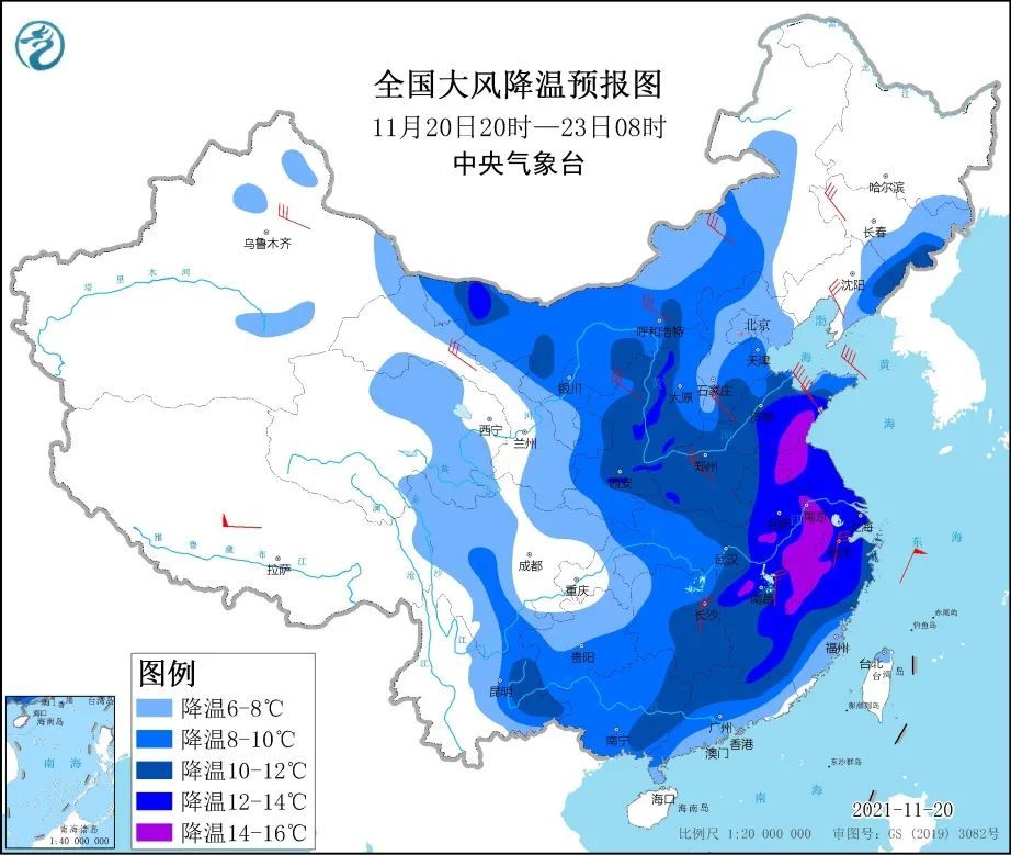 中央气象台20日18时继续发布寒潮蓝色预警:受寒潮影响,11月20日20时至23日08时,我国中东部地区将有4~6级偏北风,阵风7~9级,气温下降6~10℃,其中山西西部、黄淮东部、江淮、江南中东部等地的部分地区降温幅度可达12℃,局地14℃以上。