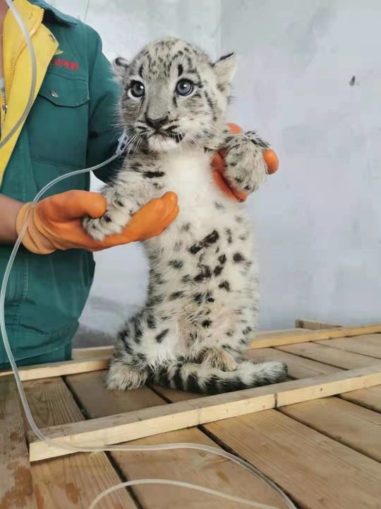 西宁野生动物园的工作人员对感染猫瘟的雪豹幼崽“油画”进行治疗(2019年8月4日摄)。新华社发(西宁野生动物园供图)