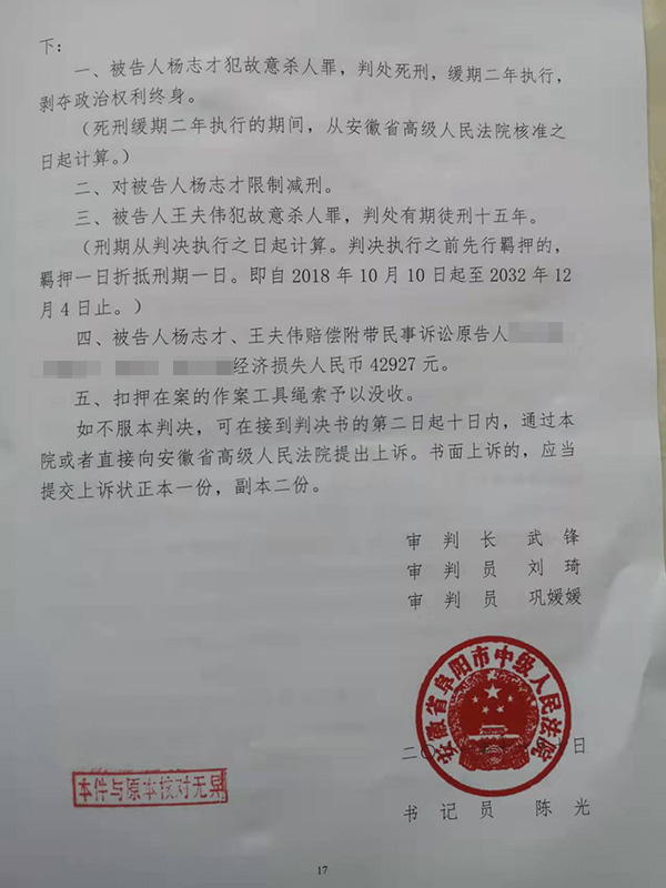 2021年11月10日,阜阳中院作出判决:被告人杨志才犯故意杀人罪,判处死刑,缓期两年执行,剥夺政治权利终身;对杨志才限制减刑。王夫伟犯故意杀人罪,判处有期徒刑15年。杨志才、王夫伟赔偿附带民事诉讼原告人经济损失42927元。