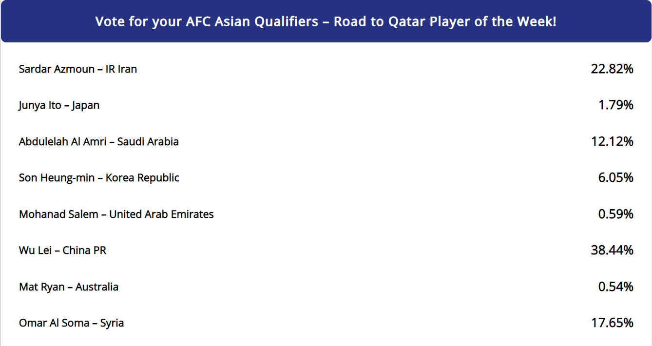 11月20日,亚足联本周最佳球员投票结束,武磊以38.44%的得票率位列第一,当选本次周最佳球员。在12强赛对阵阿曼和澳大利亚的两场比赛中,武磊为国足打入两粒进球。
