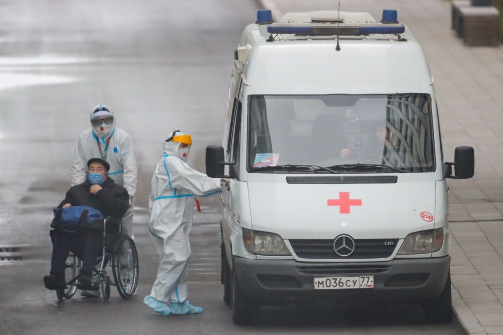 11月13日,医务人员在俄罗斯莫斯科市郊的科穆纳尔卡运送患者。(新华社发,亚历山大摄)