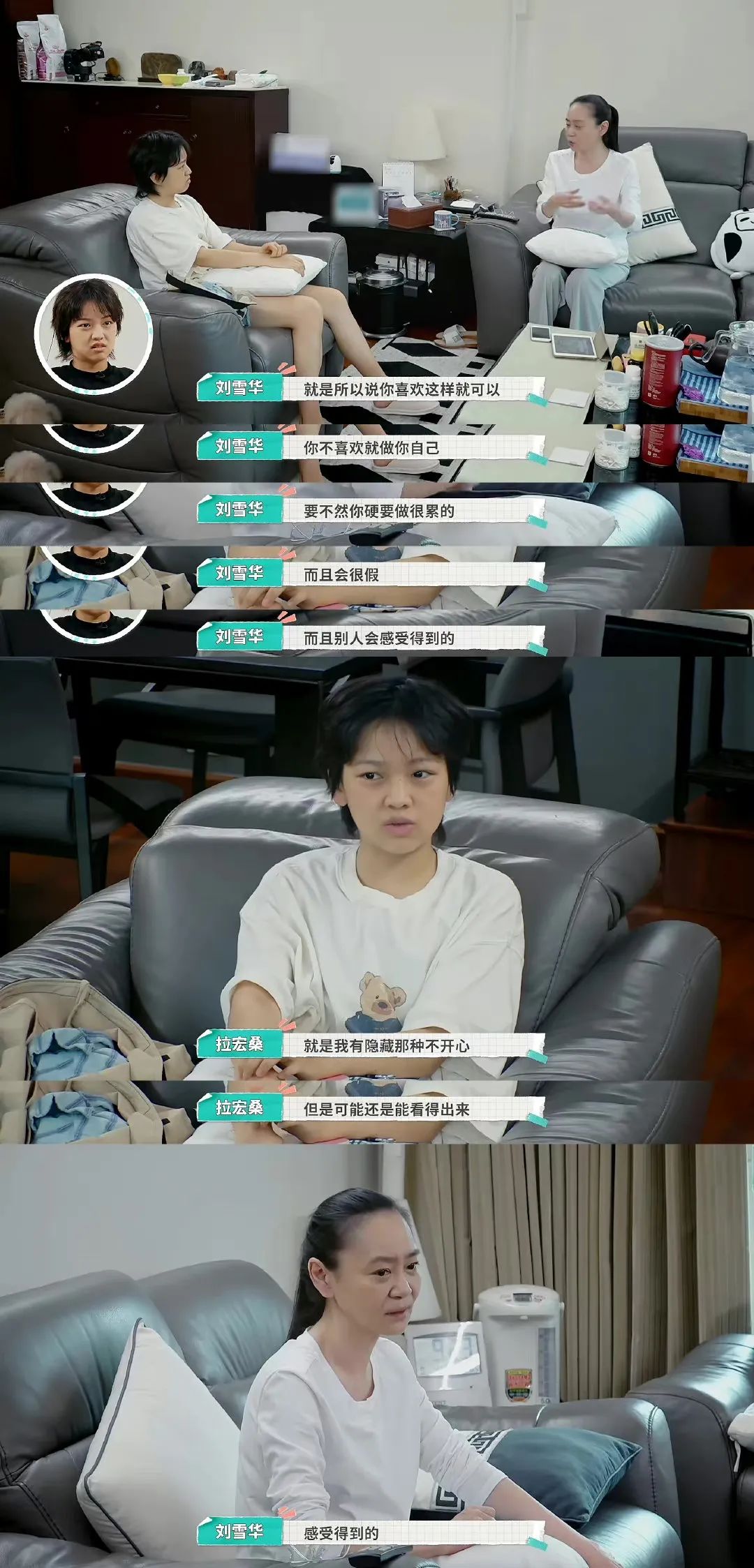 拉宏桑入住之初,社恐爆发,一度陷入自我怀疑的emo情绪之中,刘雪华迅速察觉到异样的气氛,太后式社交控场,一下子拉近了彼此间的距离。