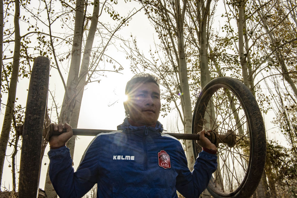 ↑在新疆疏附县萨依巴格乡尤喀克喀帕村,努尔麦麦提在自家院里练习拖轮胎跑(2021年11月10日摄)。新华社记者 马锴 摄