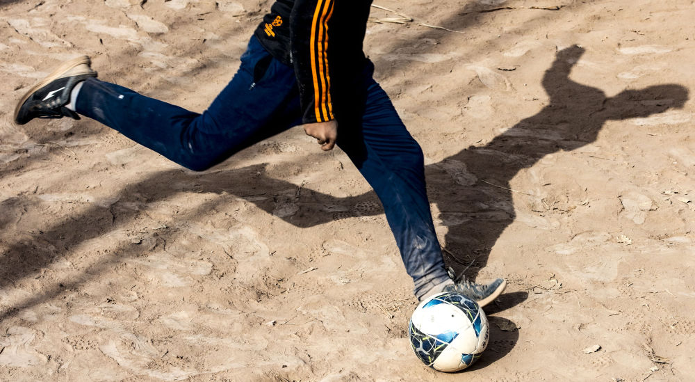 ↑在新疆疏附县萨依巴格乡尤喀克喀帕村,努尔麦麦提在自家院里练习踢球(2021年11月15日摄)。新华社记者 马锴 摄