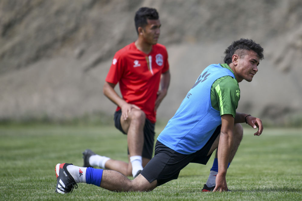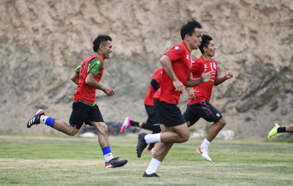 ↑在新疆天山雪豹足球队的训练场上,努尔麦麦提(左)参加试训(2020年6月19日摄)。新华社记者 王菲 摄