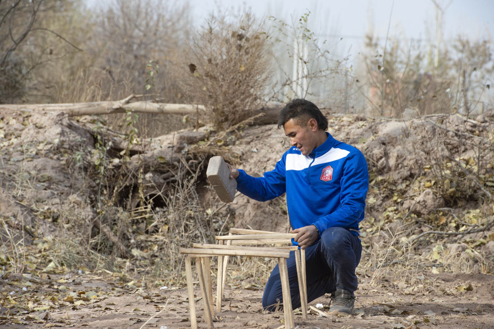↑在新疆疏附县萨依巴格乡尤喀克喀帕村,努尔麦麦提在自家玉米地里将木条砸进土里,用于练习折返跑(2021年11月10日摄)。新华社记者 马锴 摄
