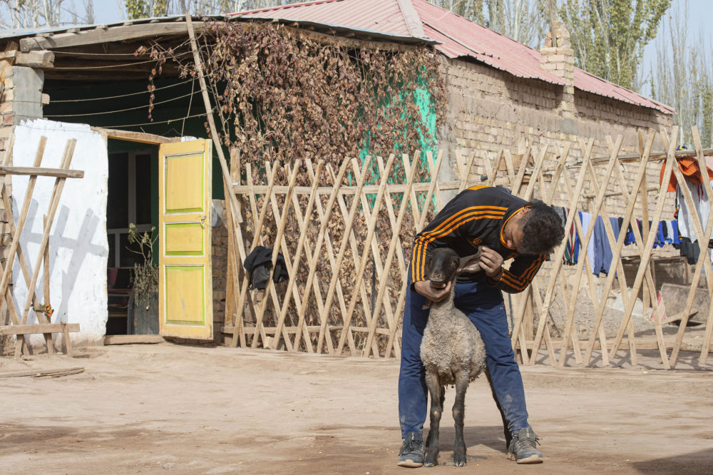 ↑在新疆疏附县萨依巴格乡尤喀克喀帕村,努尔麦麦提在自家院里检查羊的耳螨情况(2021年11月13日摄)。新华社记者 马锴 摄