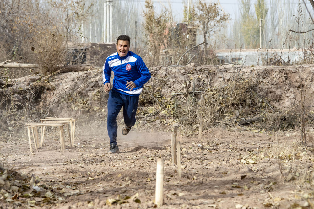 ↑在新疆疏附县萨依巴格乡尤喀克喀帕村,努尔麦麦提在自家玉米地里练习折返跑(2021年11月13日摄)。新华社记者 马锴 摄