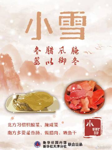 【#今日迎来小雪节气#】《2021年中国天文年历》显示,北京时间11月22日10时34分将迎来“小雪”节气。一到“小雪”,人们开始“冬腊风腌,蓄以御冬”。北方习惯积酸菜、腌咸菜,南方多要灌香肠、做腊肉、晒鱼干。今日“小雪”,你家准备吃点儿啥?(记者周润健,海报制作:方金洋)