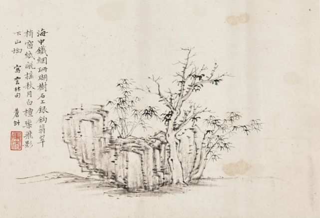 款识:海中铁网珊瑚树,石上银鈎翡翠梢。窗纸乱摇秋月白,檀栾飞影下山坳。写云林句。苍虬。