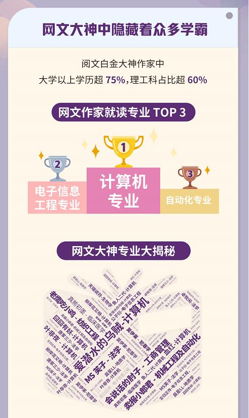 不少“学霸”隐藏在网文作家中,他们结合自己的专业背景和职业经历,创作了系列“硬核”故事。《画像》显示,阅文白金、大神作家中,大学以上学历超75%,理工科占比达60%。以文字为生的网文作家,计算机专业、电子信息工程专业、自动化专业是他们就读专业TOP3。知名作家如爱潜水的乌贼、囧囧有妖、血红和叶非夜,均是计算机专业出身,公子衍和言归正传皆为电子信息工程专业。