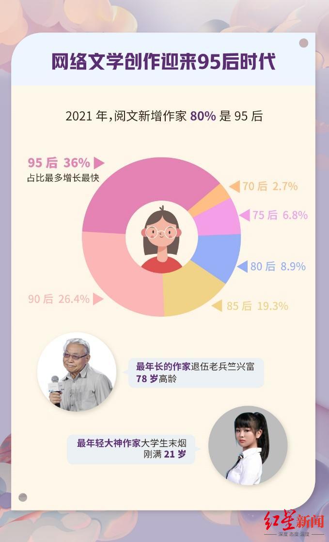 11月22日,阅文集团发布《2021网络文学作家画像》(以下简称《画像》)。《画像》显示,网络文学创作已经迎来95后时代,95后占比最多增长最快,川渝地区网文作家最多。阅文集团白金、大神作家中,大学以上学历超75%,理工科占比超60%。