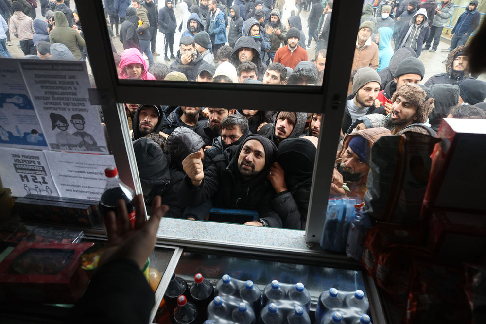 11月19日,难民在白俄罗斯与波兰边境白方一侧等待领取食物。(新华社/白通社)