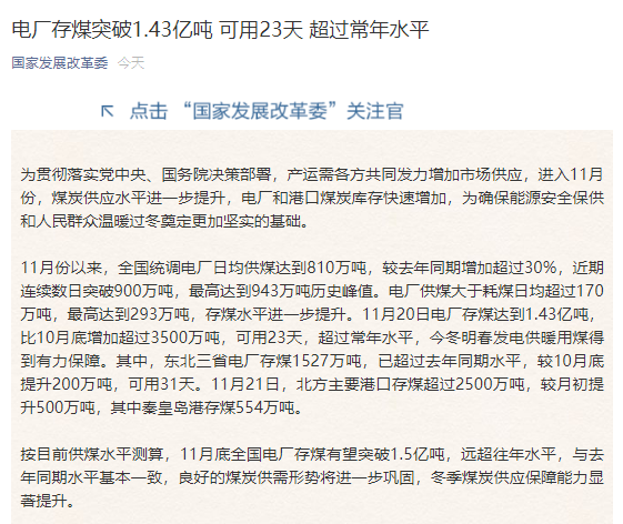 11月份以来,全国统调电厂日均供煤达到810万吨,较去年同期增加超过30%,近期连续数日突破900万吨,最高达到943万吨历史峰值。电厂供煤大于耗煤日均超过170万吨,最高达到293万吨,存煤水平进一步提升。11月20日电厂存煤达到1.43亿吨,比10月底增加超过3500万吨,可用23天,超过常年水平,今冬明春发电供暖用煤得到有力保障。其中,东北三省电厂存煤1527万吨,已超过去年同期水平,较10月底提升200万吨,可用31天。11月21日,北方主要港口存煤超过2500万吨,较月初提升500万吨,其中秦皇岛港存煤554万吨。