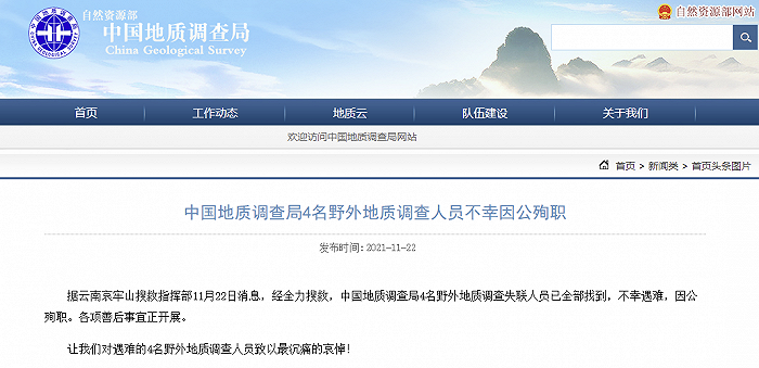 中国地质调查局网站消息,据云南哀牢山搜救指挥部11月22日消息,经全力搜救,中国地质调查局4名野外地质调查失联人员已全部找到,不幸遇难,因公殉职。各项善后事宜正开展。