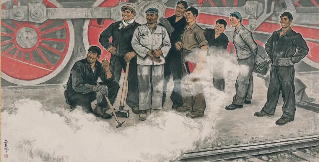随着第一台国产蒸汽机车试车的成功,新中国从此拥有了自主研发制造蒸汽机车的能力。1964年,画家卢沉有感于中国人民在自主设计研制国产蒸汽机车所展现出的自力更生、攻坚克难的奋斗精神,创作了中国画《机车大夫》。