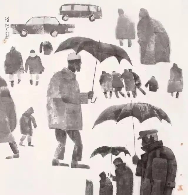 画家在刻画人物细节时,创作手法别有匠心,人物的轮廓以方折笔法勾出,突出工人高大坚实的身躯。他们身上的工作服则以皴擦和晕染相结合的手法加以描绘,生动地表现出工作服布料的坚硬质地和修理工作留下的污痕。画面以巨大的机车车轮作为背景,暗示了工人们的工作地点和修理对象,而车轮鲜红的颜色和工人的工作服的深色又形成了色彩的反差对比。
