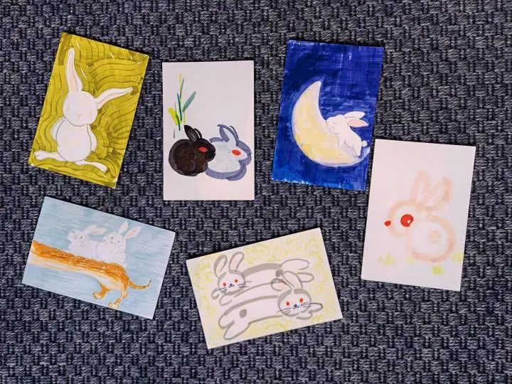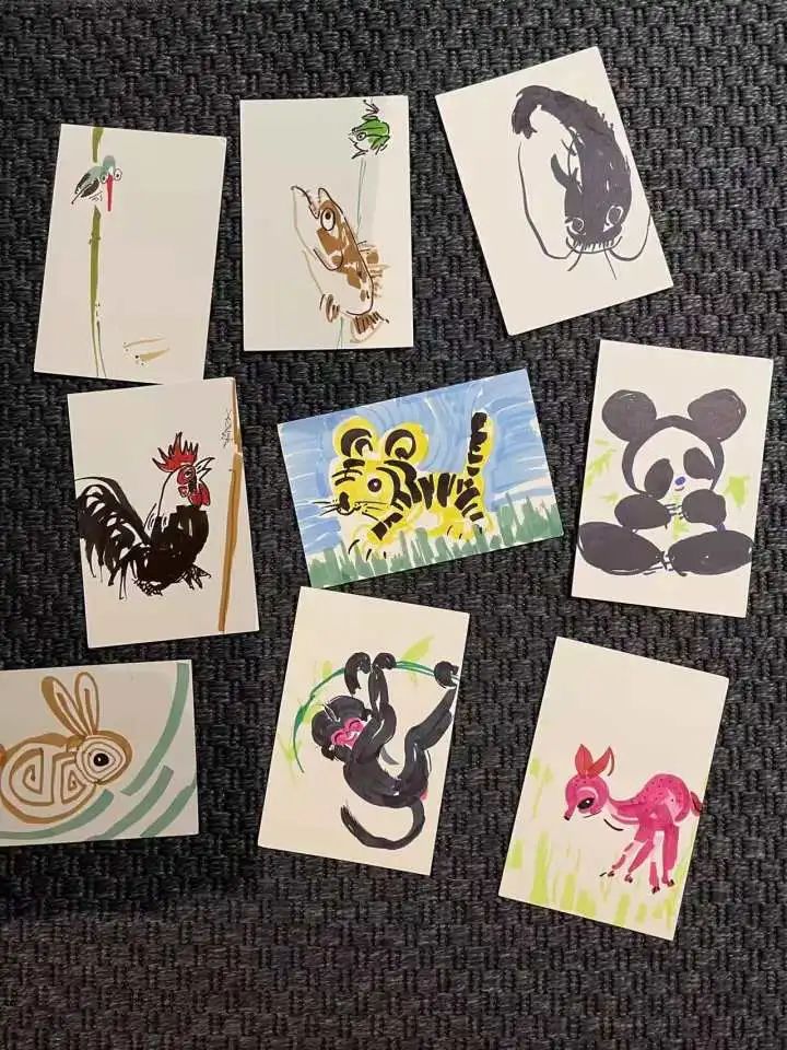 为什么周末会画这么多明信片?郑女士说,要从前阵子女儿的美术作业说起。那次,老师布置画大公鸡,女儿回家后,爸爸陪着一起进行了创作。“我女儿把作业带去学校,同学们都很羡慕,都抢着想要那幅画。”回家后,女儿把这事一说,表达了想送给同学的想法。郑女士想得更仔细:如果有的同学有、有的同学没有,好像也不大好……于是乎,家里一商量,索性爸爸就开启“接单”模式,或按照小朋友们的制定要求,或自己创作,忙乎了整个周末。然后今天周一,女儿就开开心心带着几十幅新鲜出炉的明信片去学校分给同学们了。
