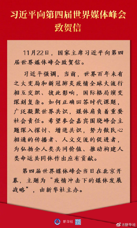 【权威快报丨习近平向第四届世界媒体峰会致贺信】11月22日,国家主席习近平向第四届世界媒体峰会致贺信。
