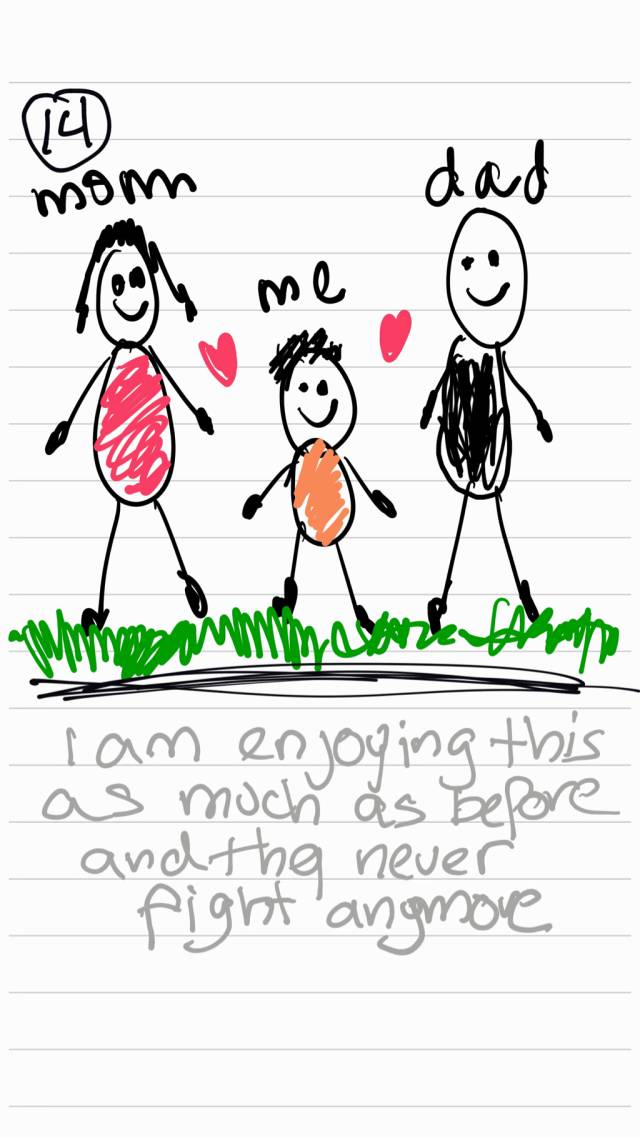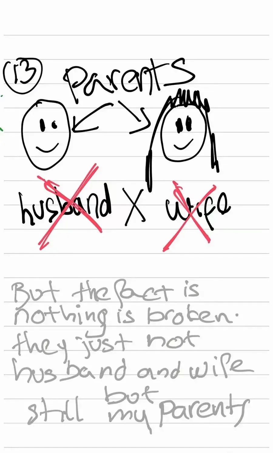 13. 但其实呢,我觉得我的家并没有遭到任何破坏,只是爸爸妈妈不再是夫妻了,但他们还是我的爸爸和妈妈。