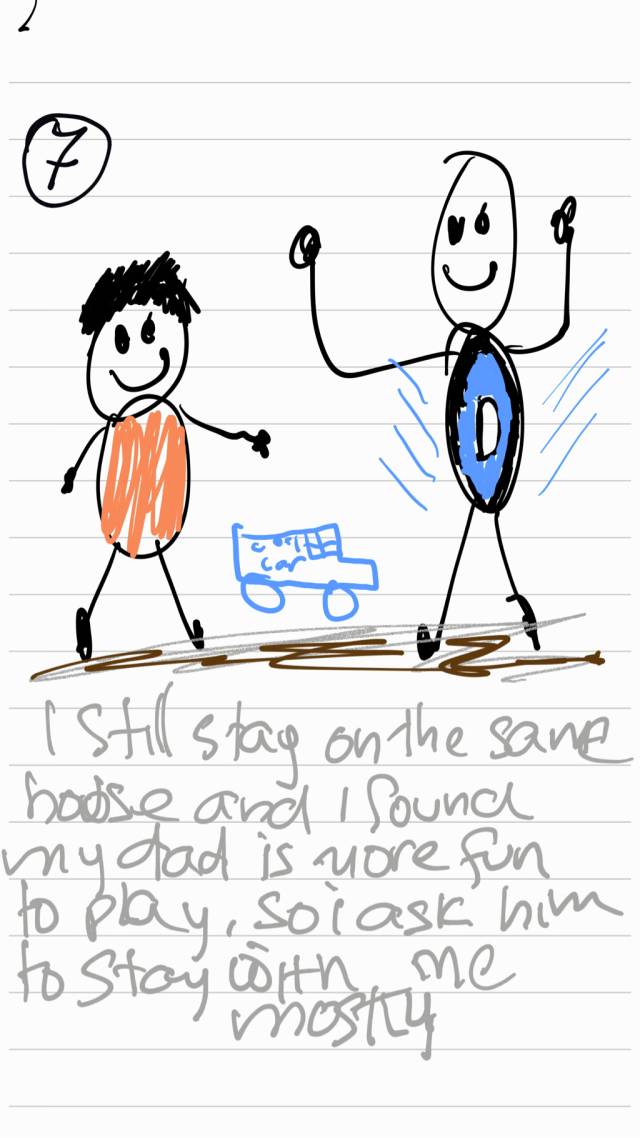 7. 我还继续呆在原来的房子里,而且我发现爸爸会变得比以前更有趣啦,于是我总会要他在家陪我。