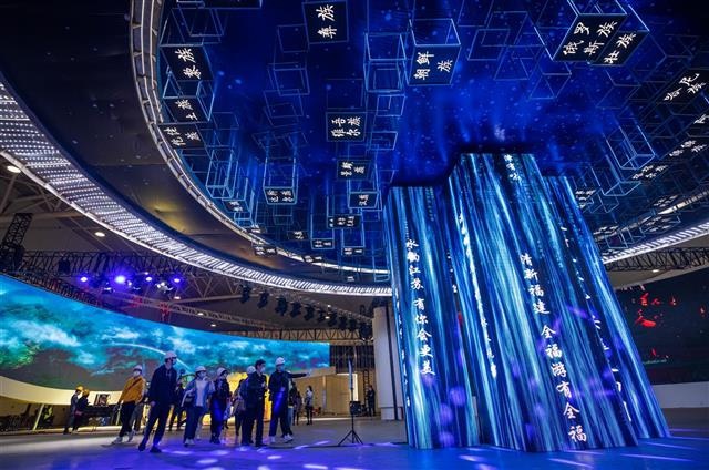 日前记者参观了预展展厅。一进入展馆,迎面而来是“仰望星空”的流体艺术装置,56个民族多彩缤纷,主轴屏上循环播放着视觉盛宴“大美中国”主题片,将我国壮丽的名山大川进行全景呈现。