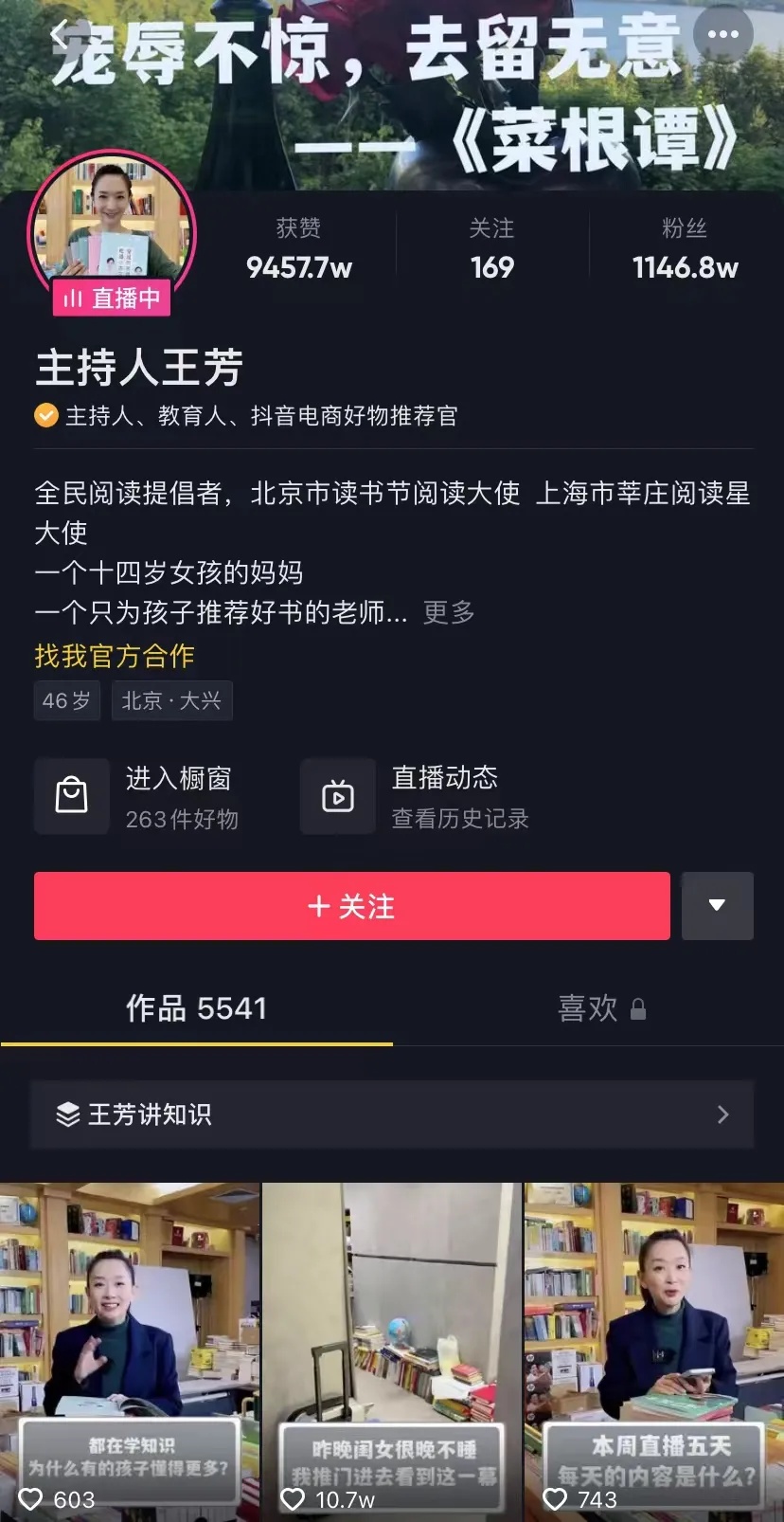 现在王芳的抖音号有1146万粉丝,她每周能保持5期、每期6个小时的直播。对于2020年刚进入这个领域的王芳来说,这样的成绩是那时的她难以想象的,因为进入这个圈子对其而言纯粹是误打误撞。2012年王芳创立了一家电视节目公司,2020年因为疫情原因公司经营陷入停顿,在朋友的建议下,王芳开始尝试直播,“当时的想法是希望在抖音上推广自己的书,能够有一些收入给员工发工资”。