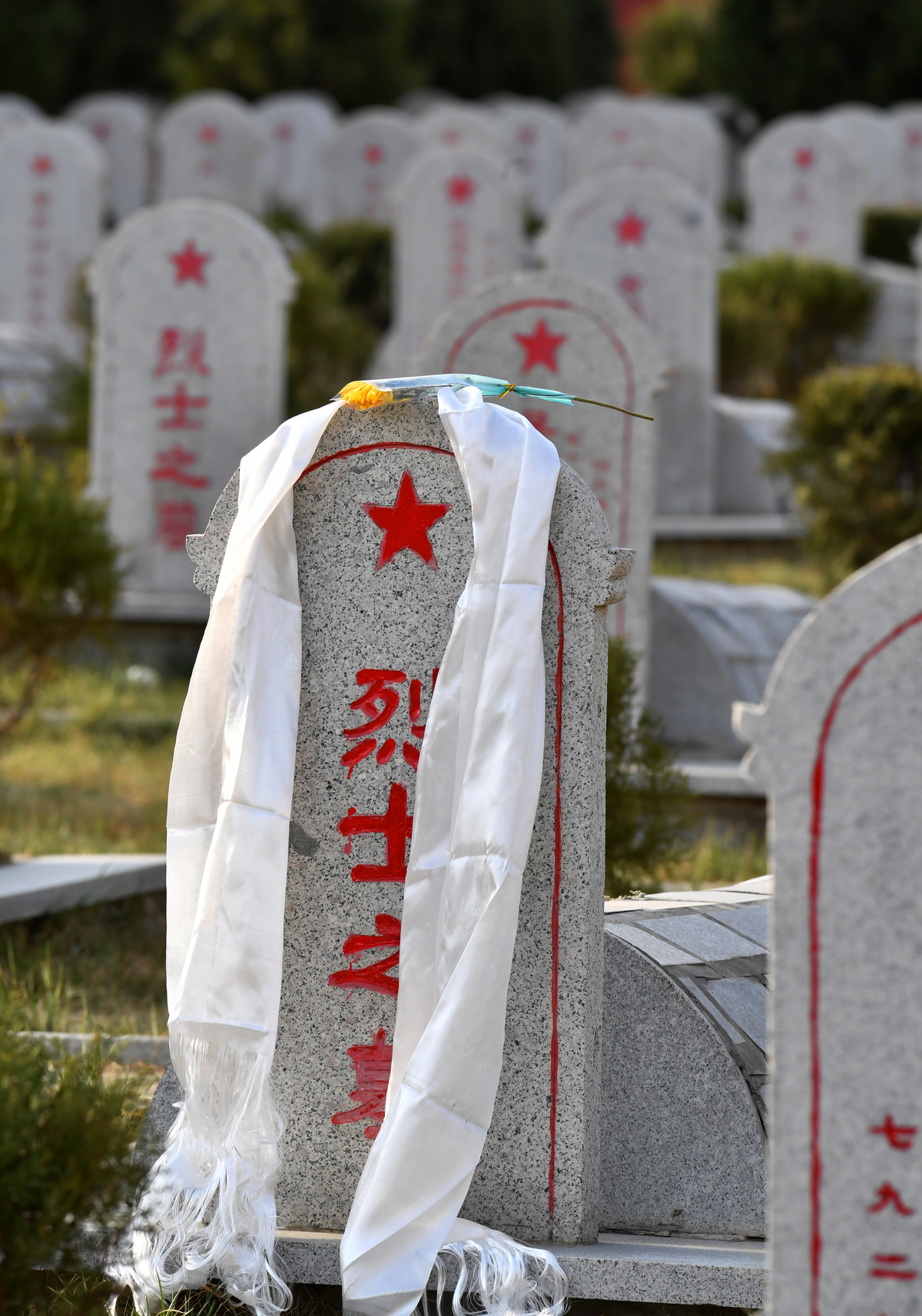 在西藏拉萨烈士陵园,一条洁白的哈达挂在烈士墓碑上(4月4日摄)。新华社记者觉果摄