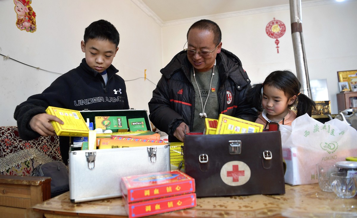 秋加(中)和他的孩子在整理药箱(1月14日摄)。新华社记者张汝锋摄